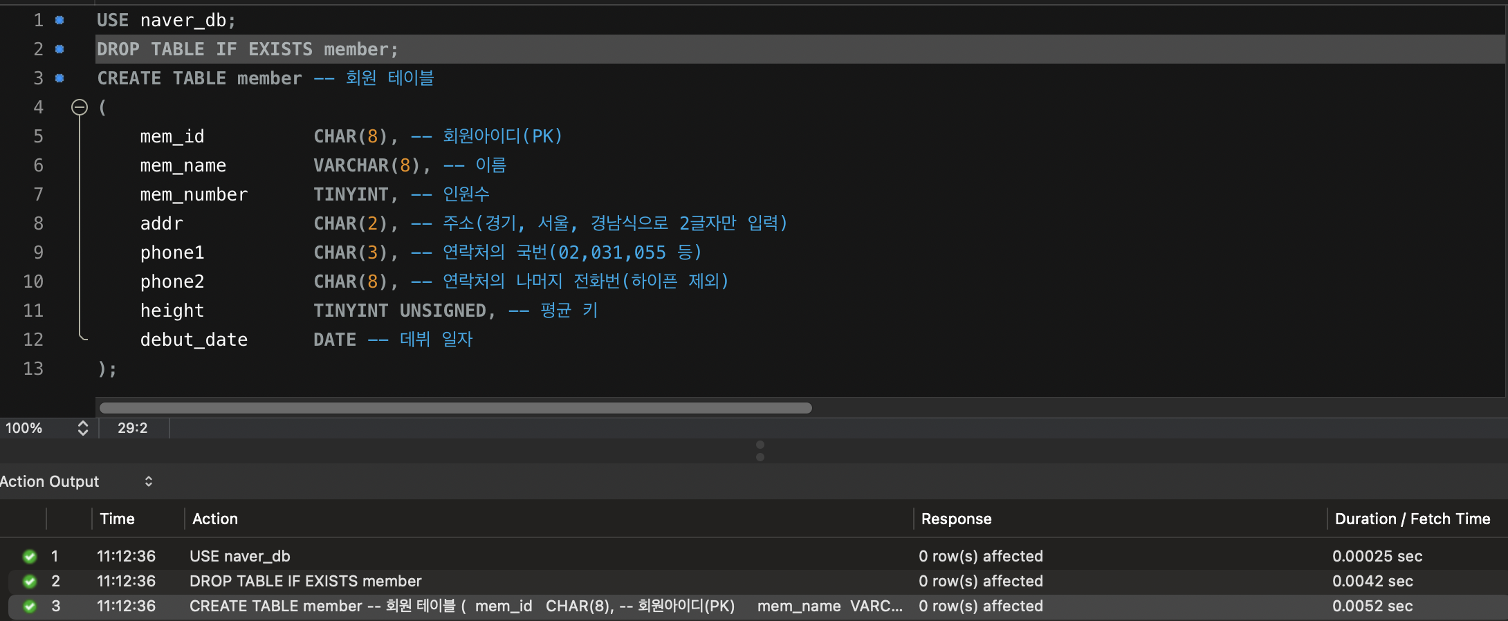 ② CREATE TABLE 구문으로 관련 테이블을 생성합니다.