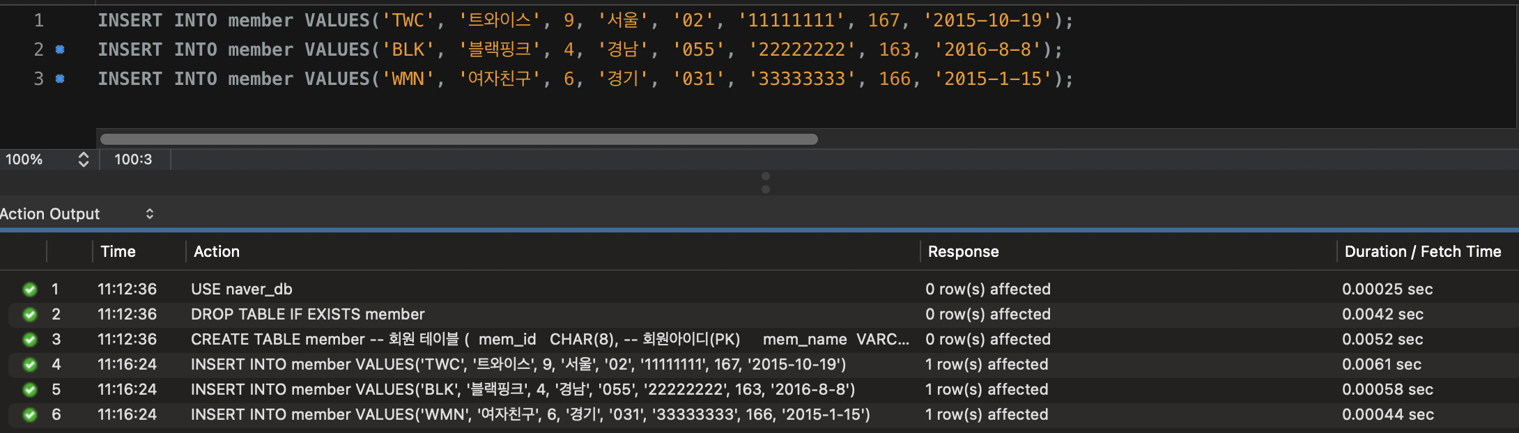 ③ INSERT INTO 구문을 이용하여 주어진 데이터들을 입력합니다. 하단 Output의 체크표시를 통해 올바르게 결과가 출력된 것을 확인할 수 있습니다.